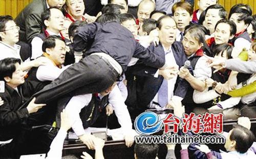 臺“立法院”有過多少次肢體沖突,可能無人統(tǒng)計,但始作俑者,可以追溯到上世紀(jì)80年代前“綠委”、“國會戰(zhàn)神”朱高正在“立院”的暴力問政,于是大家有樣學(xué)樣。各“立委”暴力問政的花樣還真不少。丟鞋、扔水瓶、掌摑、襲胸、噴瓦斯、鎖“立院”大門、霸占主席臺,甚至2007年“綠委”王淑慧還上演吃掉提案的奇觀。而今年1月19日,“立院”一天爆發(fā)三次沖突,從早晨打到半夜的丑聞,更被美國CNN等國際媒體大肆報道。