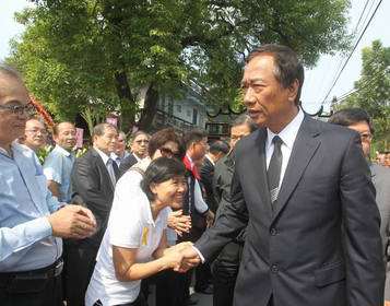 鴻海集團(tuán)董事長(zhǎng)郭臺(tái)銘(右一)也出席告別式,離去時(shí)不少民眾上前與他握手。(圖片來自臺(tái)媒)