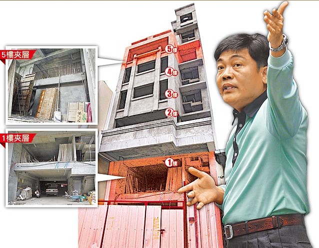 書記官楊金池與妻子申請興建5層獨(dú)立住宅,卻在1樓與5樓蓋非法夾層(白框處),讓5樓變7樓。(臺媒圖)