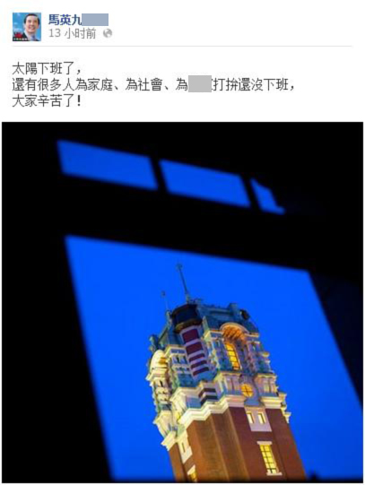 馬英九的臉書大多是PO出前一天重要場合的公開發(fā)言,或針對特定紀(jì)念日發(fā)文,少有短訊,但12日下班時間卻發(fā)文說:“太陽下班了,還有很多人為家庭、為社會、為臺灣打拚還沒下班,大家辛苦了!”,結(jié)果卻遭到島內(nèi)網(wǎng)友痛罵,指責(zé)他不知民間疾苦。(圖片來源:馬英九個人臉書網(wǎng)頁)