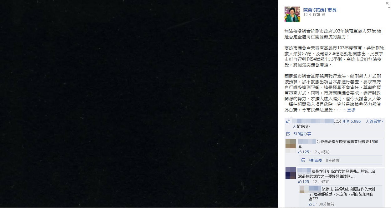 陳菊臉書PO全黑照片,抗議市議會刪預(yù)算。(臺媒翻拍陳菊市長臉書)