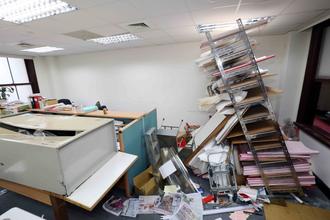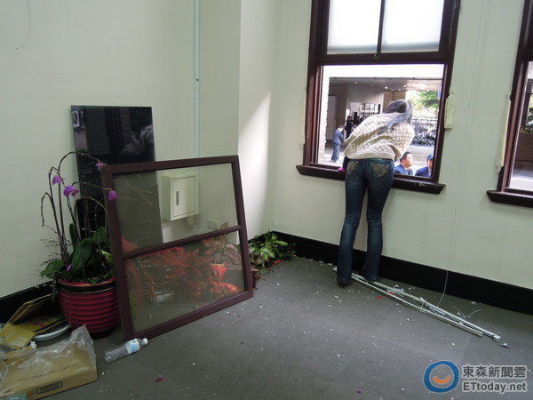“政委”陳希舜的辦公室,能破的都破了,滿地煙灰垃圾,桌椅都被移動到辦公室外。(圖片來自臺媒)