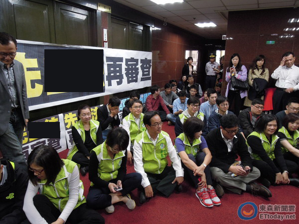中國臺灣網(wǎng)4月2日消息 據(jù)臺灣媒體報(bào)道,臺“內(nèi)政委員會召委”、國民黨“立委”張慶忠2日排審服貿(mào),民進(jìn)黨“立委”前一夜就夜宿會議室,2日早上7點(diǎn)30分在會議室外靜坐,并用“先‘立法’、再審查”的海報(bào)封住會議室大門,阻止國民黨進(jìn)入開會,而“立法院”的議事人員也被擋在門外。