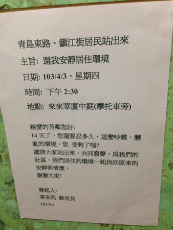 當(dāng)?shù)氐睦镩L在許多小區(qū)內(nèi)張貼告示“青島東路、鎮(zhèn)江街居民站出來”,希望在4月3日下午2點(diǎn)30分,到青島東路上來來華廈的中庭聚會(huì),要求大家一起發(fā)聲,不要再忍受吵雜、臟亂的環(huán)境,希望還給居民安靜與清潔的生活空間。(中國臺(tái)灣網(wǎng) 高旭)