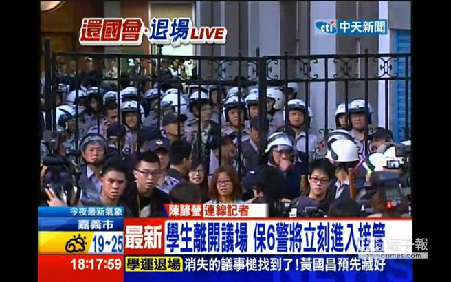 學(xué)生離開議場(chǎng),警察立刻進(jìn)入接管。(圖片來自臺(tái)媒)