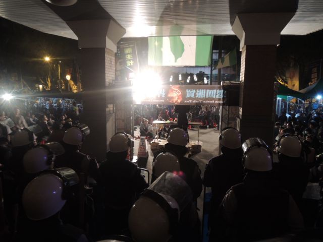 反服貿(mào)學(xué)生雖已退出議場,但部分“獨派”團體人士仍占領(lǐng)“立法院”大門前廣場不肯離去,警方也嚴陣以待。(圖片來自臺媒)