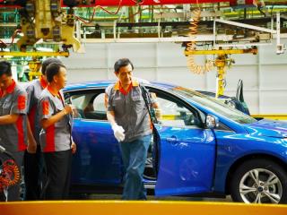 勞動節(jié)到來前夕,馬英九在桃園縣長吳志揚等人陪同下,于今天上午參訪了優(yōu)良人力資源管理企業(yè)——福特六和汽車股份有限公司。馬英九除聽取簡報外,還在現(xiàn)場技術人員指導協(xié)助下,組裝汽車的車門。馬英九完成后,跟技術人員一起比贊。