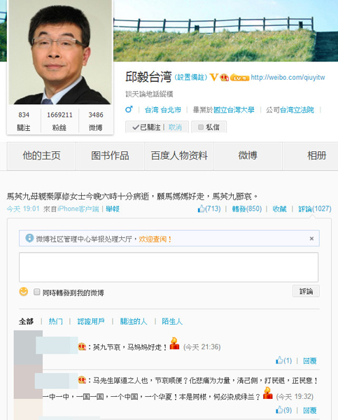 秦厚修病逝,陸網友微博「點蠟燭」哀悼。(圖片取自邱毅微博)