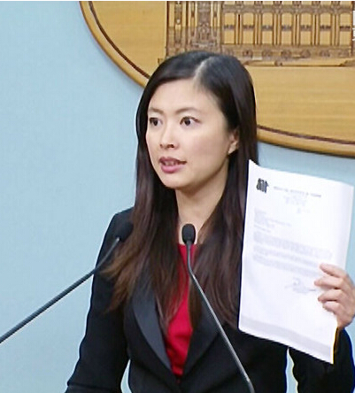 馬英九辦公室發(fā)言人李佳霏拿出AIT文件,證明馬英九放棄綠卡在美已結(jié)案。(臺(tái)媒圖)
