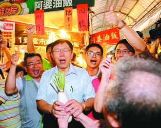 柯隨后到三水市場(chǎng)拜票時(shí),熱情的攤商特地送上“菜頭”,祝他有“好彩頭”。許多民眾看到柯文哲都特別湊上前去,向他比出大拇指喊“加油”。柯文哲見(jiàn)到年長(zhǎng)的民眾,也自然流露醫(yī)師本色,問(wèn)候身體健康狀況。