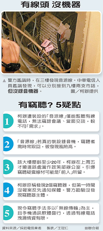 柯辦表示,位于建國南路上利眾大樓的柯辦政策部辦公室有竊聽器并向警方報(bào)案。轄區(qū)大安分局、市刑大、鑒識中心先后到場勘查采證,卻沒找到竊聽器,只在3樓找到一條“音源線”。該線若搭配錄音設(shè)備,確實(shí)能聽到九樓柯辦的電話內(nèi)容,卻無法竊聽到會議和當(dāng)面交談內(nèi)容。