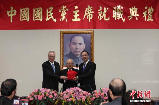 1月19日上午,中國(guó)國(guó)民黨主席就職典禮在位于臺(tái)北市的國(guó)民黨中央黨部舉行。圖為國(guó)民黨代理主席吳敦義(左)向新當(dāng)選黨主席朱立倫(右)移交印信。 中新社發(fā) 路梅 攝