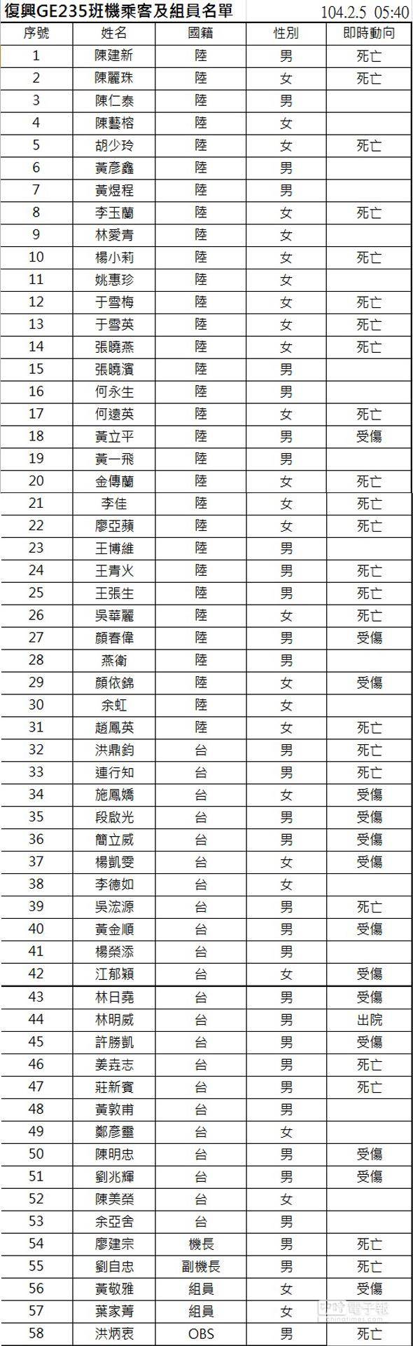 中國臺(tái)灣網(wǎng)2月5日消息 據(jù)臺(tái)灣《中時(shí)電子報(bào)》報(bào)道,臺(tái)灣復(fù)興航空墜毀基隆河,根據(jù)臺(tái)灣“民航局”最新死傷名單,已確認(rèn)陸客16人、臺(tái)灣8人死亡,詳細(xì)姓名、傷亡狀況請見下表: