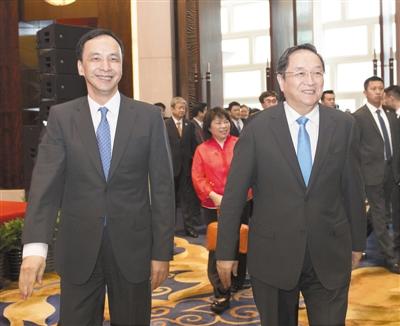 昨日,上海浦東,俞正聲與朱立倫共同步入第十屆兩岸經(jīng)貿(mào)文化論壇會(huì)場(chǎng)。新華社記者 王曄 攝