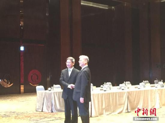 國務(wù)院臺(tái)辦主任張志軍(左)23日下午在金門,與臺(tái)灣方面陸委會(huì)主委夏立言(右)舉行會(huì)面。中新網(wǎng)發(fā) 記者 鄭巧攝