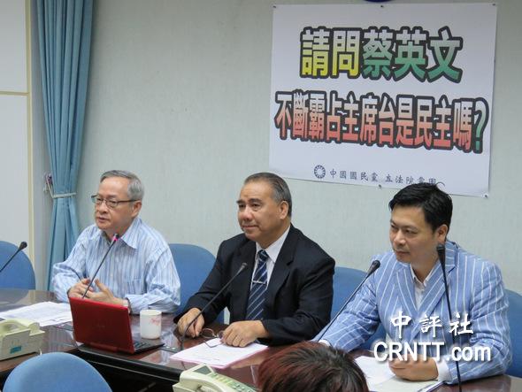 國民黨“立院”黨團(tuán)書記長廖國棟、“立委”林郁方、吳育仁舉行“請問蔡英文,不斷霸占主席臺是民主嗎?”記者會,質(zhì)疑蔡英文說一套做一套。