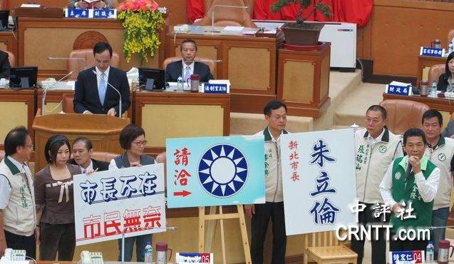 據(jù)香港中評社報道 新北市議會3日舉行第2屆第1次定期會市政總質(zhì)詢,由民進黨展開共同質(zhì)詢和個人質(zhì)詢,民進黨議員舉牌向國民黨主席、新北市長朱立倫抗議,認(rèn)為朱立倫只處理黨務(wù),沒時間處理市政,并有議員要求朱立倫好好思考,朱在講臺上被“罰站”了30分鐘。