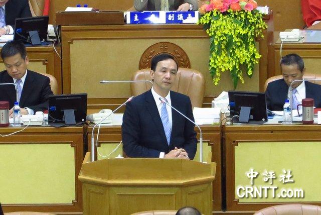 朱立倫在臺(tái)上被杯葛,頗為無(wú)奈。(中評(píng)社彭媁琳攝)