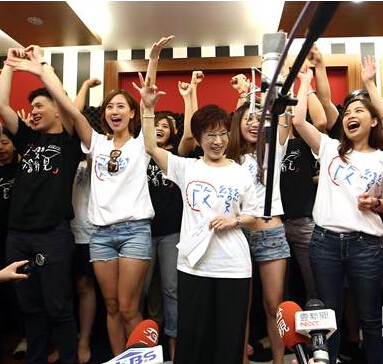 臺(tái)灣“立法院副院長”洪秀柱(中)11日到錄制室與青年朋友共同錄制競選歌曲《勇敢翻轉(zhuǎn)》,氣氛high到不行。(中時(shí)電子報(bào)圖 陳信翰攝)