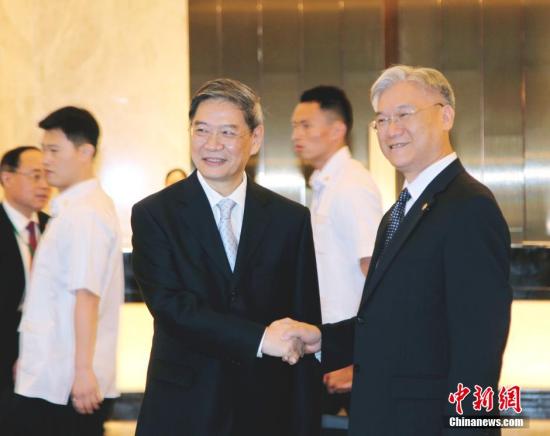 資料圖:5月23日,國務(wù)院臺灣事務(wù)辦公室主任張志軍與臺灣方面大陸委員會主任委員夏立言,在金門舉行雙方兩岸事務(wù)主管部門負責(zé)人第三次會面,聚焦大陸向金門供水等民生議題,并就兩岸關(guān)系問題交換意見。圖為張志軍抵達會場時,與夏立言握手致意并交談。黃少華 攝