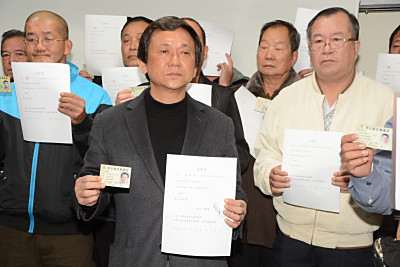 因不滿且抵制臺(tái)南市長(zhǎng)賴清德干涉臺(tái)南市議會(huì)議長(zhǎng)選舉,陳朝來(lái)(中)遭民進(jìn)黨開除黨籍。圖為陳朝來(lái)“自行”宣布退黨。(資料圖)