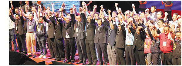 臨全會閉幕,中國國民黨全體黨代表舉手高呼團(tuán)結(jié)。 圖片來源:中新社