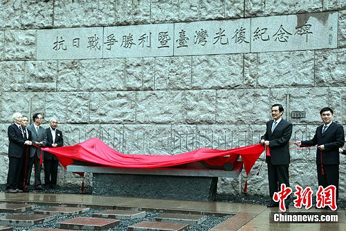 資料圖:2011年10月25日,臺灣地區(qū)領(lǐng)導(dǎo)人馬英九在臺北中山堂外廣場為“抗戰(zhàn)勝利暨臺灣光復(fù)紀(jì)念碑”碑文落成揭幕。右二為馬英九。(中新社發(fā) 陳立宇 攝 )