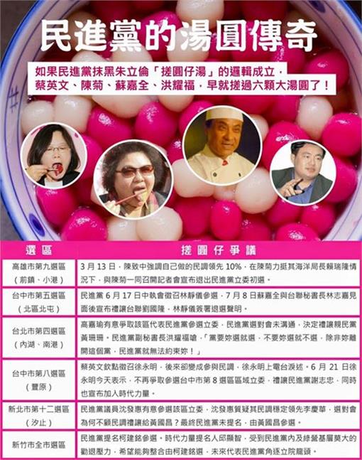 國民黨“搓圓仔湯”事件,如今正式進(jìn)入司法調(diào)查階段,但“藍(lán)委”蔡正元卻不以為然,在facebook上發(fā)圖,揭發(fā)綠營(yíng)早就“搓過圓仔湯”。他表示,“蔡英文、陳菊、蘇嘉全、洪耀福,早就搓過6顆大湯圓”,同時(shí)整理出綠營(yíng)“搓圓仔湯爭(zhēng)議”,包括高雄市長(zhǎng)陳菊力挺賴瑞隆,導(dǎo)致陳致中退出“立委”初選,以及蔡英文征召徐永明卻變成參與民調(diào)等6件爭(zhēng)議。