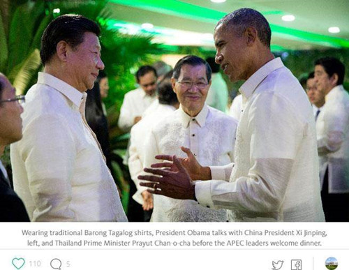 索薩的這篇文章以鏡頭后的觀察為主、描述奧巴馬與各國領(lǐng)袖私下與非正式場合的互動,將APEC歡迎晚宴開始前、“習奧蕭會”設(shè)為文章的主照片、放在最上方,照片中,奧巴馬與中國國家主席習近平對話,而兩人中間就是面露招牌微笑的蕭萬長。蕭也身著由鳳梨纖維制成的菲律賓國服“巴隆”,但索薩在早前的圖說中卻寫成了“奧巴馬與習近平(左)、巴育三人在晚宴前交談”。