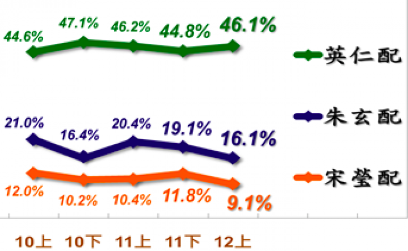 距離2016年臺灣地區(qū)領(lǐng)導(dǎo)人選舉僅剩下最后一個(gè)月,“臺灣指標(biāo)民調(diào)”12月14日公布最新一份民意調(diào)查,調(diào)查結(jié)果顯示,在國民黨朱立倫和王如玄、民進(jìn)黨蔡英文和陳建仁、親民黨宋楚瑜和徐欣瑩這3組競選人中,46.1%民眾投“英仁配”、16.1%的民眾會選擇“朱玄配”、而會投票給“宋瑩配”的人則占9.1%,另外,12.4%的受訪者表明自己不會投票或者投廢票,還有16.3%的人尚未做出明確表態(tài)。
