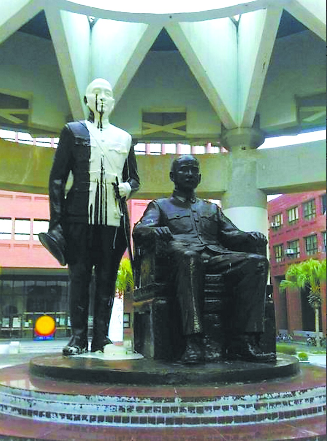 28日,島內(nèi)多地蔣介石銅像遭到污損和丑化。《聯(lián)合報(bào)》稱,宜蘭公園蔣介石銅像遭人噴漆,連帶孫中山銅像也被波及。東森新聞稱,去年曾在南投向蔣介石銅像涂漆的石育民,28日再度在南投市中興會(huì)堂前,給蔣介石銅像蓋上一塊白布,看起來(lái)就像“披麻戴孝”。