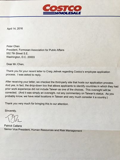“臺灣人公共事務(wù)會”在社交網(wǎng)站“臉書”(Facebook)上寫到,他們平時都定期會寫信給公司、政府機構(gòu)和組織,“要求”這些單位“停止將臺灣指為中國的一個省”。因此,最近有人通報他們好市多也有相同情形,在上個月就寫信提醒好市多能夠進(jìn)一步修正。