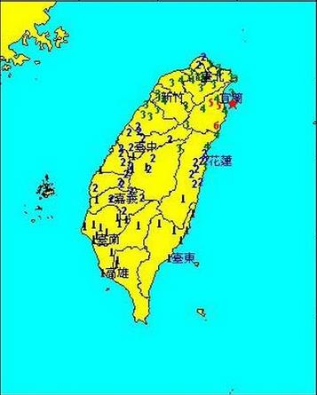 地震區(qū)域示意。圖中☆表示震中位置,阿拉伯數(shù)字表示震度。震度4級即表示中等烈度地震,震度6級即表示強烈度地震。(圖片來源:臺灣氣象部門網(wǎng)站)