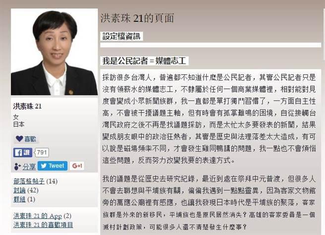 據(jù)悉,由臺灣公共電視文化事業(yè)基金會成立的“PeoPo公民新聞”,在2007年4月30日成立了公民新聞平臺。洪素珠在2008年11月27日加入,并以“素素”為名,大量撰寫各類政治報道。不過“素素”在2010年7月24日曾發(fā)布一則報道“走入1975記憶里的眷村記錄片”,內(nèi)文中卻稱“我是臺灣外省人”,但她并不認為自己是“外省人”,還說“我很自豪地說自己是臺灣人”。