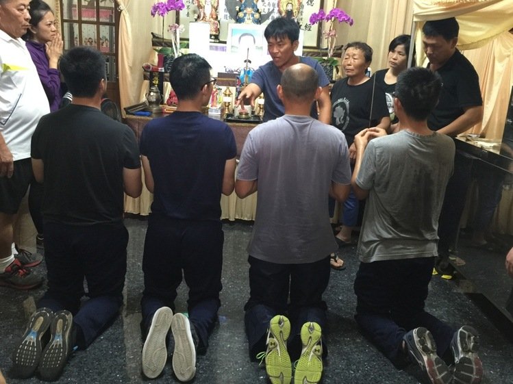 7月3日,臺金江艦長林伯澤、兵器長許博為、士官長陳銘修、中士高嘉駿(依左至右)到黃文忠靈堂前上香下跪道歉,遭家屬痛罵。