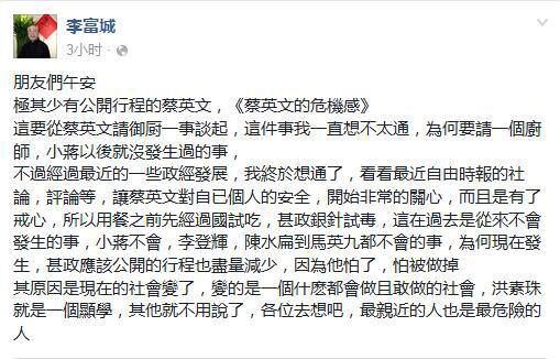 李富城在文中稱,一直想不通蔡英文為何要自費(fèi)請(qǐng)廚子,不過(guò)經(jīng)過(guò)最近的一些政經(jīng)發(fā)展,才搞清楚了。李富城稱,看看最近的《自由時(shí)報(bào)》的社論、評(píng)論等,蔡英文對(duì)個(gè)人安全開(kāi)始非常的關(guān)心,而且是有了戒心,所以用餐之前要先經(jīng)過(guò)試吃,甚至銀針試毒。李富城稱,這在蔣經(jīng)國(guó)、李登輝、陳水扁以及馬英九時(shí)代都不會(huì)發(fā)生的事情,現(xiàn)在發(fā)生在蔡英文時(shí)代,“因?yàn)樗铝耍卤蛔龅簟,甚至?yīng)該公開(kāi)的行程也盡量減少了。