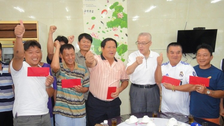 吳敦義與護(hù)島漁民一同合照。(圖片來源:臺(tái)灣《聯(lián)合報(bào)》)