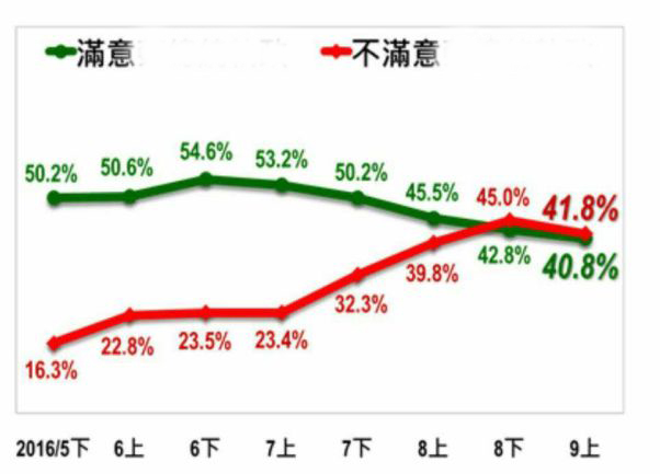 中國臺(tái)灣網(wǎng)9月14日訊 據(jù)臺(tái)灣東森新聞云報(bào)道,民進(jìn)黨當(dāng)局上任后民調(diào)直直落,“臺(tái)灣指標(biāo)民調(diào)”14日公布最新民調(diào),結(jié)果顯示,蔡英文的滿意度已出現(xiàn)“死亡交叉”, 40.8%滿意、41.8%不滿意;林全“內(nèi)閣”滿意度僅剩31.7%,不滿意度達(dá)47.2%。