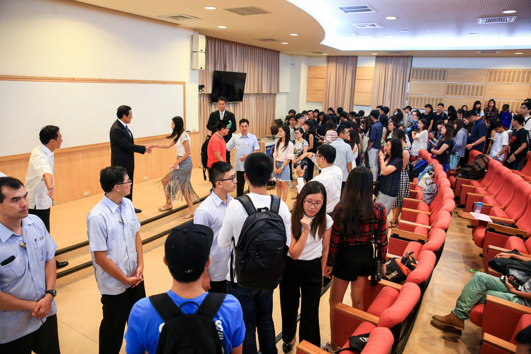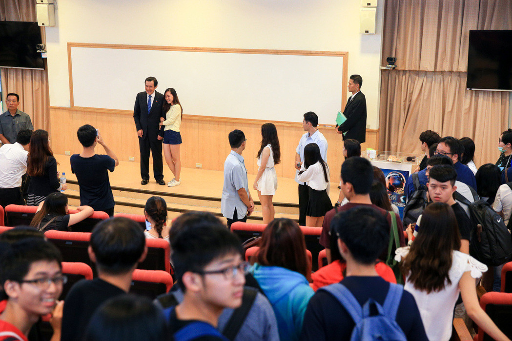 演講結(jié)束后,開放學(xué)生與“馬老師”合照,吸引學(xué)生大排長龍等待合影,POSE從最基本的握手、勾手臂、搭肩膀到擁抱,顯示馬英九卸任后人氣依然不減。