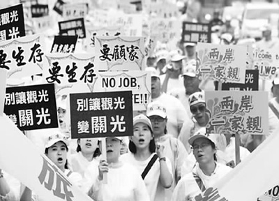 民進(jìn)黨執(zhí)政百天,民怨四起。圖為9月12日,臺灣觀光業(yè)界冒雨大游行。(資料圖片)