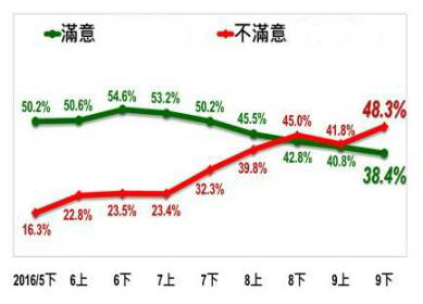 據臺媒報道,島內“指標民調”調查民眾對蔡英文執(zhí)政滿意度,最新結果顯示,38.4%受訪者表示滿意,48.3%不滿意。對照9月上旬的民調,不滿意度增加6.5%,進一步加劇呈現“死亡交叉”。