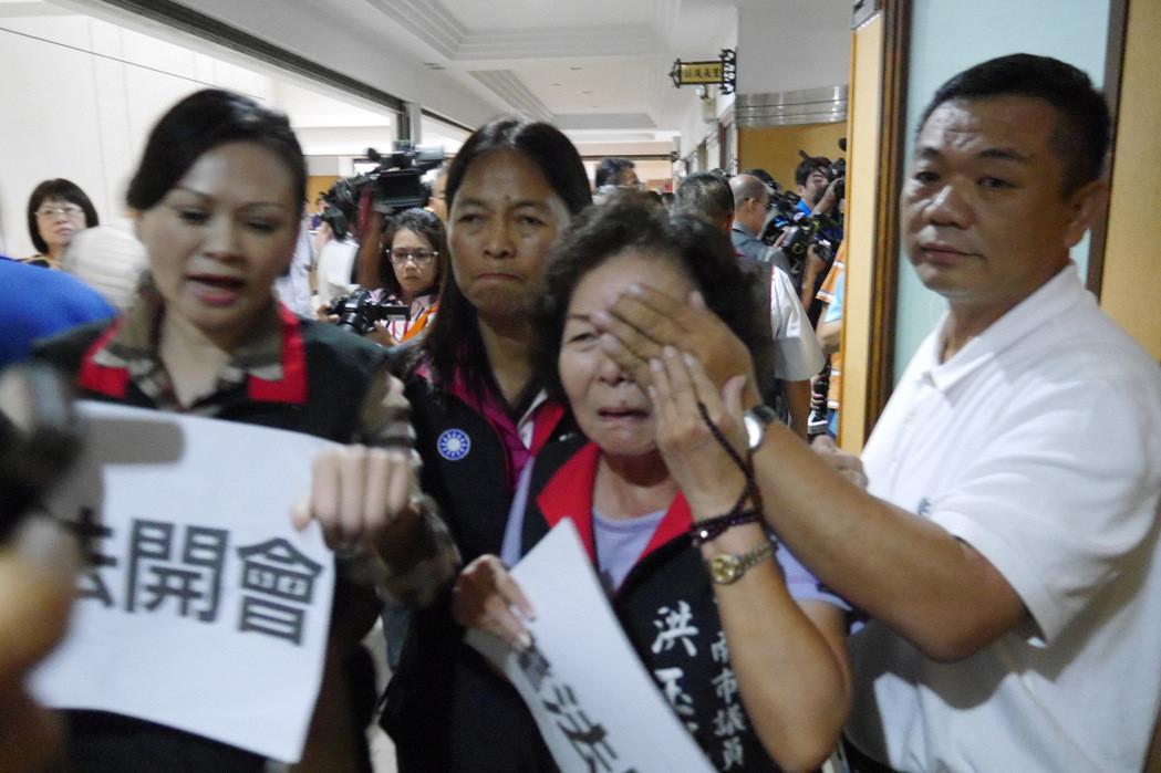臺(tái)南市議會(huì)今天發(fā)生肢體沖突,國(guó)民黨市議員洪玉鳳(右二)被打傷。(圖片來(lái)源:臺(tái)灣《聯(lián)合報(bào)》)