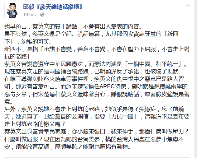 據(jù)香港中評(píng)社10月11日?qǐng)?bào)道,中國(guó)國(guó)民黨前“立委”、臺(tái)灣經(jīng)濟(jì)研究院董事邱毅在10日晚間在社交網(wǎng)站“臉書(shū)”(Facebook)發(fā)文,針對(duì)臺(tái)灣當(dāng)局領(lǐng)導(dǎo)人蔡英文“雙十節(jié)”講話提出兩岸關(guān)系“承諾不會(huì)變,善意不會(huì)變,不會(huì)在壓力下屈服,不會(huì)走上對(duì)抗的老路”的“新四不”,批評(píng)蔡英文拾“貪扁”(陳水扁)牙慧,幼稚的可笑。