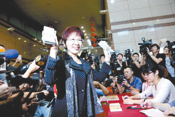 24日,國民黨主席洪秀柱參加“特別黨費(fèi)勸繳”活動(dòng)。