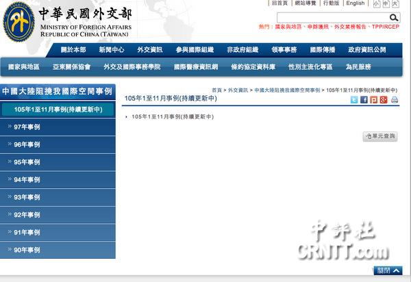 據(jù)悉,陳水扁執(zhí)政時(shí)期,臺(tái)外事部門即在官方網(wǎng)站上刊出“大陸阻撓我國(guó)際空間事例”。而馬英九上任后就再未公開過,相關(guān)網(wǎng)頁(yè)也一直空白至今。