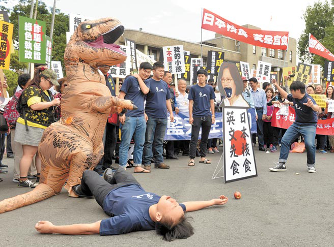11月18日,國(guó)民黨號(hào)召各縣市議員至蔡當(dāng)局“行政院”抗議日本核災(zāi)食品輸臺(tái),演出行動(dòng)劇諷刺蔡英文一意孤行。(臺(tái)灣“中時(shí)”報(bào)系資料圖)