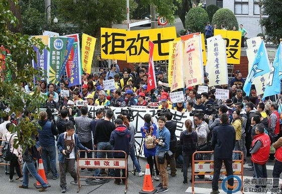 工斗等勞團(tuán)在臺(tái)灣“立法院”外抗議一例一休。(圖/記者季相儒攝)圖片來源:臺(tái)灣“東森新聞網(wǎng)”