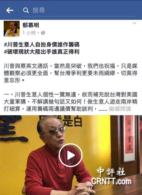 新黨主席郁慕明在“臉書(shū)”上發(fā)表對(duì)蔡英文與特朗普通話(huà)的看法(圖片來(lái)源:中評(píng)社)