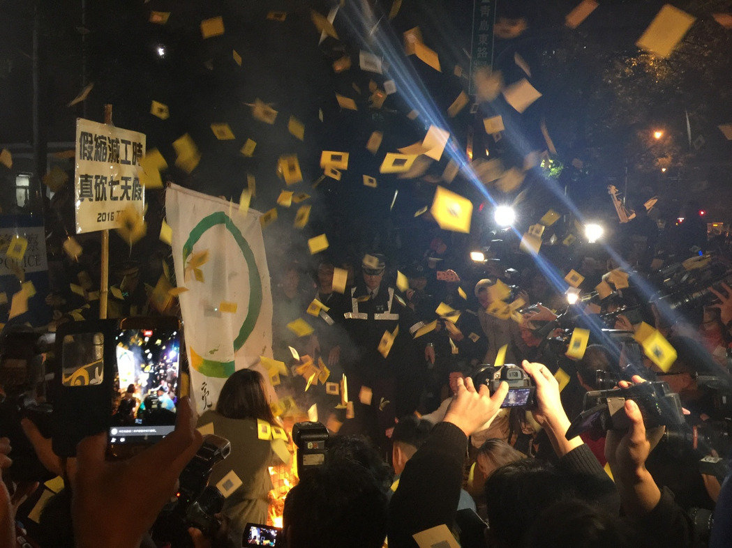 據(jù)報道,場外抗議的勞工團體得知消息后,現(xiàn)場先是彌漫低氣壓,隨即轉(zhuǎn)為憤怒,大喊“民主進步,過橋(指奈何橋)。點亮臺灣,過橋”?棺h群眾氣憤丟執(zhí)煙霧彈,并燃燒蔡英文競選時“點亮臺灣”的旗幟,更揚撒大量冥紙,表示要送民主進步“上路”。勞團高喊“無恥蔡‘政府’,砍假拼經(jīng)濟”,嗆聲“如果民進黨這么愛錢,我們就燒給他們”,隨即高喊“過橋了”。