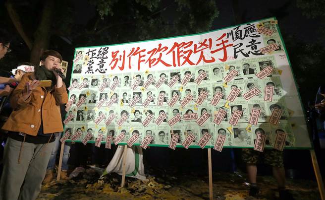 抗議勞團隨后一一點名每名投下砍假贊成票的民進黨“立委”名字以及所屬選區(qū),并在他們的照片上貼上“砍假兇手”。